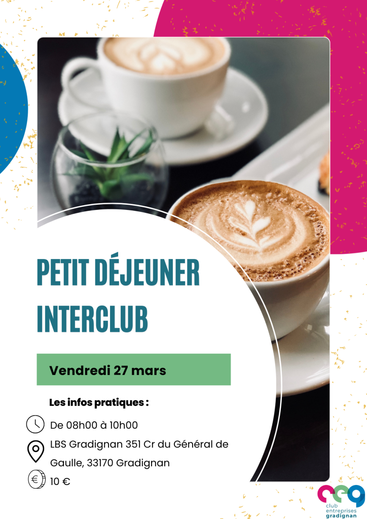 ☕ Petit-déjeuner inter-club chez LBS Et si on élargissait le réseau autour d’un café ? Nous vous donnons rendez-vous pour un petit-déjeuner inter-club chez LBS à Gradignan. Un moment privilégié pour rencontrer les membres des clubs voisins, échanger, créer de nouvelles opportunités et développer votre réseau dans une ambiance conviviale et dynamique. Venez petit-déjeuner, réseauter et multiplier les connexions dans un cadre propice aux échanges professionnels. Les infos pratiques : 📅 Date : Vendredi 27 mars 🕰️ Heure : de 8h00 10h00 📍 Lieu : LBS – 351 Cours du Général de Gaulle, 33170 Gradignan 💲Participation : 10 € Nous espérons vous retrouver nombreux pour ce temps fort inter-clubs. INSCRIPTIONS CLOTURE DES INSCRIPTIONS LE 20 mars